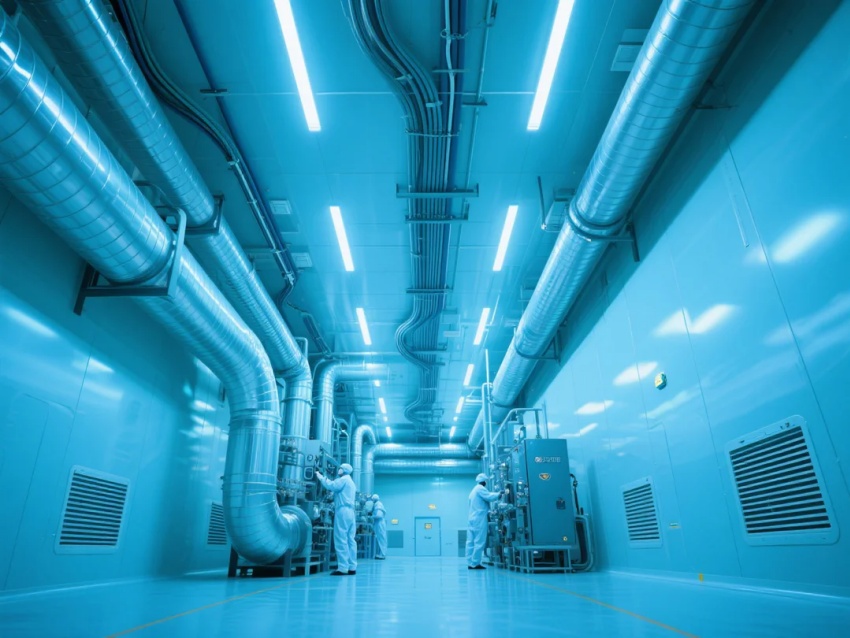 圍護系統:采用50mm厚金屬夾芯彩鋼板墻體,表面覆有抗靜電涂層,接縫處采用圓弧過渡設計,避免積塵。天花板采用FFU(風機過濾單元)滿布布局,配合高效HEPA過濾器,確保垂直層流氣流組織,潔凈度穩定控制在≤1,000顆粒/立方米(≥0.5μm)。
