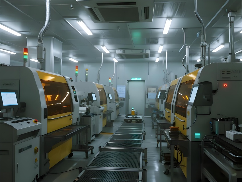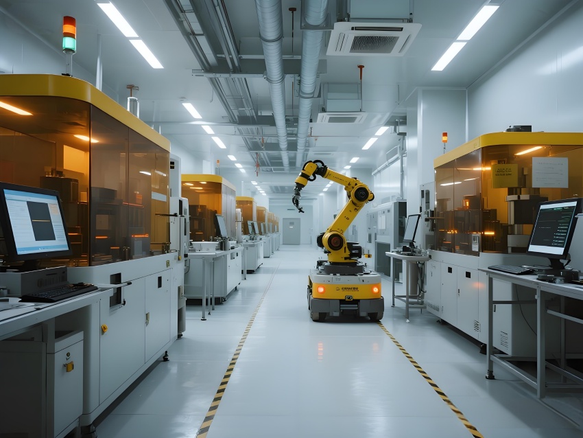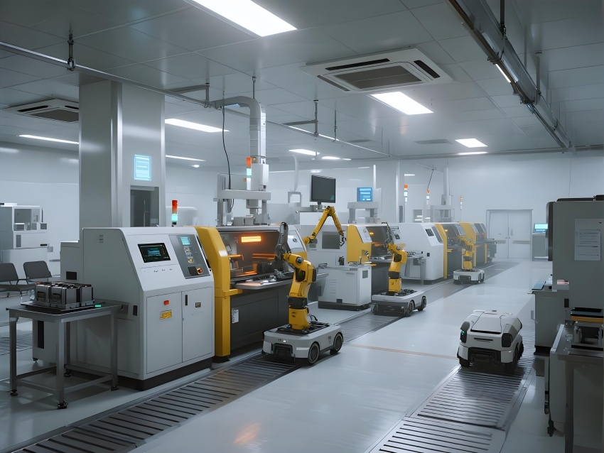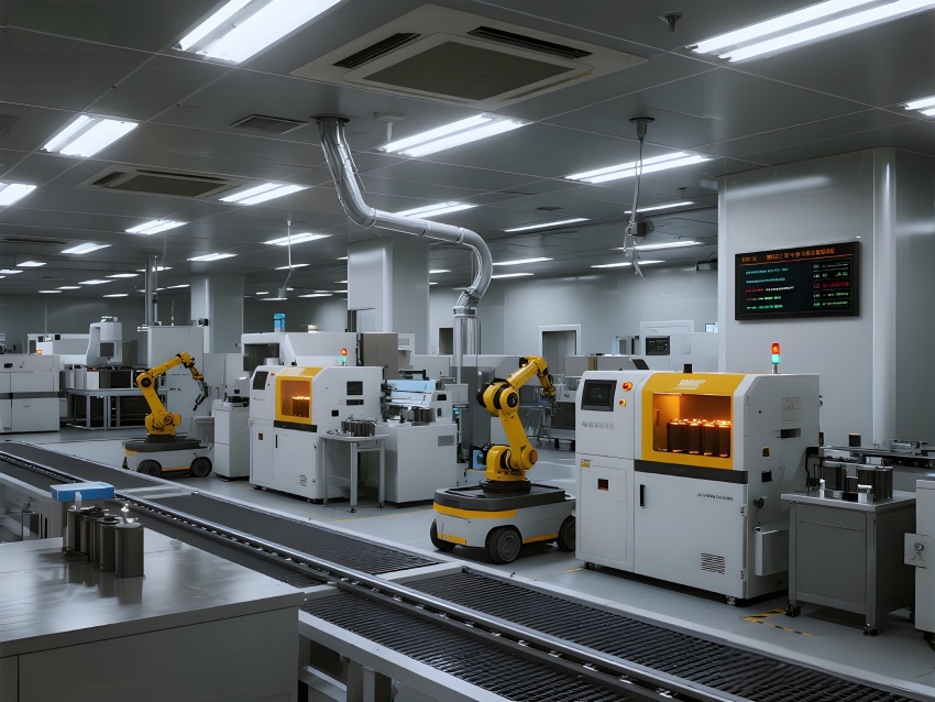 本車間以“精密制造+極致潔凈”為核心,采用未來工業(yè)風(fēng)設(shè)計(jì),主色調(diào)為冷銀灰與警示黃,強(qiáng)化功能分區(qū)。頂棚矩陣式FFU單元配合地面格柵回風(fēng),形成垂直層流,藍(lán)色氣流軌跡可視化突顯潔凈度。電極區(qū)配備全封閉涂布機(jī),機(jī)械臂精準(zhǔn)運(yùn)作;電芯裝配區(qū)采用防靜電工作臺(tái),激光焊接火花與冷色調(diào)環(huán)境形成對(duì)比。注液區(qū)全封閉氮?dú)馐痔紫浯钆溏晟瘓?bào)燈,確保絕對(duì)干燥?;蓞^(qū)排列著智能溫控柜,數(shù)據(jù)看板實(shí)時(shí)監(jiān)控電池參數(shù)。AGV機(jī)器人沿磁軌穿梭,與懸吊式管道系統(tǒng)構(gòu)成高效物流網(wǎng)絡(luò)。整體空間融合精密機(jī)械的冷峻美學(xué)與智能制造的科技感,打造高可靠性的鋰電池生產(chǎn)環(huán)境。