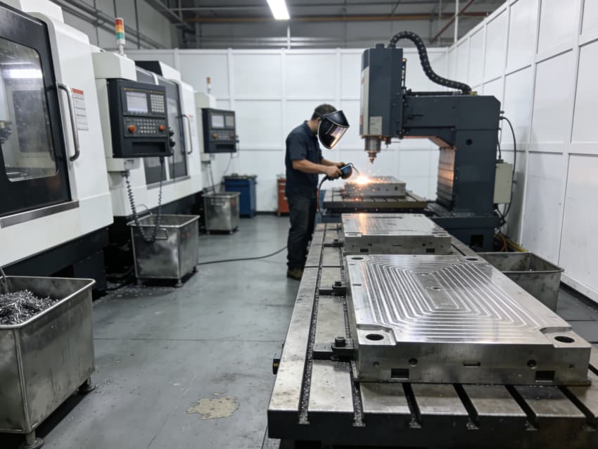 本廠房是一座集精密加工、質量檢測、智能倉儲與設備運維于一體的現代化生產基地,廠房核心加工區排布著多臺進口 CNC 加工中心,采用多軸聯動控制系統,可實現復雜曲面、精密孔系的一體化加工,滿足微米級精度要求;一旁的特種加工工位上,技術人員正在進行模具表面的精密焊接與打磨,為高難度工裝件提供定制化工藝支持。