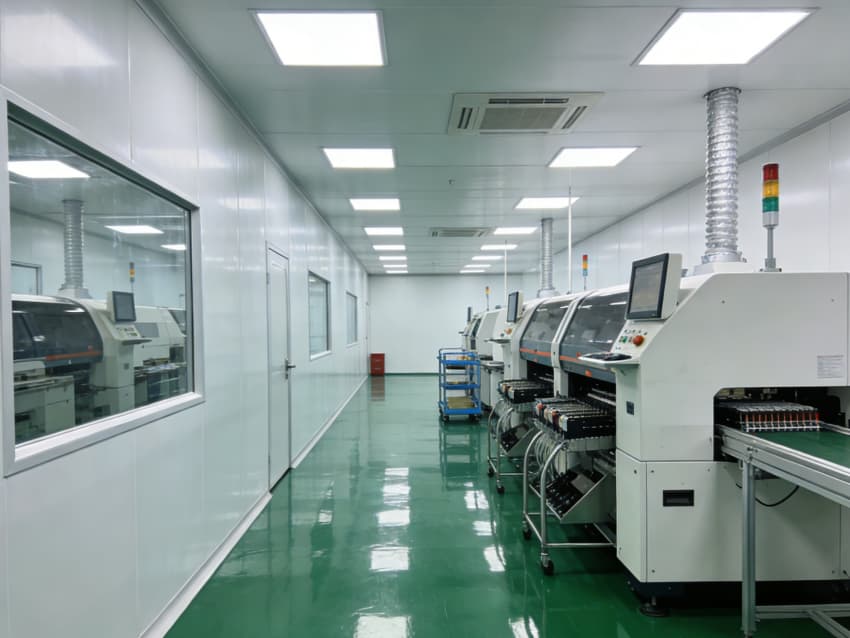 SMT 核心生產(chǎn)區(qū):針對(duì)高速貼片機(jī)、回流焊等設(shè)備做了地面承重加固與管線預(yù)埋,配置伸縮式通風(fēng)除塵管道,及時(shí)收集焊煙與粉塵;防靜電工作臺(tái)搭配 LED 工位燈,保障貼片、焊接的精度與效率。