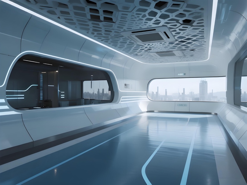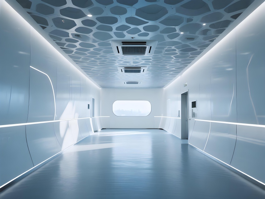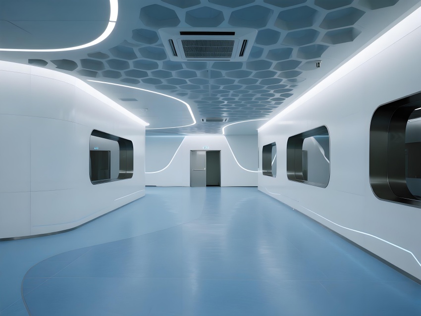 本車間空間以冰川藍(lán)與鈦白為主色調(diào),弧形墻角與無(wú)縫地坪構(gòu)成流暢的潔凈界面,頂部蜂窩狀FFU陣列形成科技感天花肌理。灌裝區(qū)透明亞克力防護(hù)罩展示自動(dòng)化生產(chǎn)線運(yùn)作,配合層流工作臺(tái)的紅色氣流可視化設(shè)計(jì),強(qiáng)化無(wú)菌核心概念。功能模塊通過(guò)地面灰色導(dǎo)視帶串聯(lián),設(shè)備區(qū)的鏡面不銹鋼與控制面板的藍(lán)色背光形成冷調(diào)光效。玻璃觀察窗嵌入電子壓差計(jì),走廊的漸變光環(huán)境引導(dǎo)系統(tǒng)在滿足GMP動(dòng)態(tài)監(jiān)測(cè)要求的同時(shí),營(yíng)造出未來(lái)實(shí)驗(yàn)室般的專業(yè)氛圍,緩解員工長(zhǎng)時(shí)間密閉作業(yè)的疲勞感。