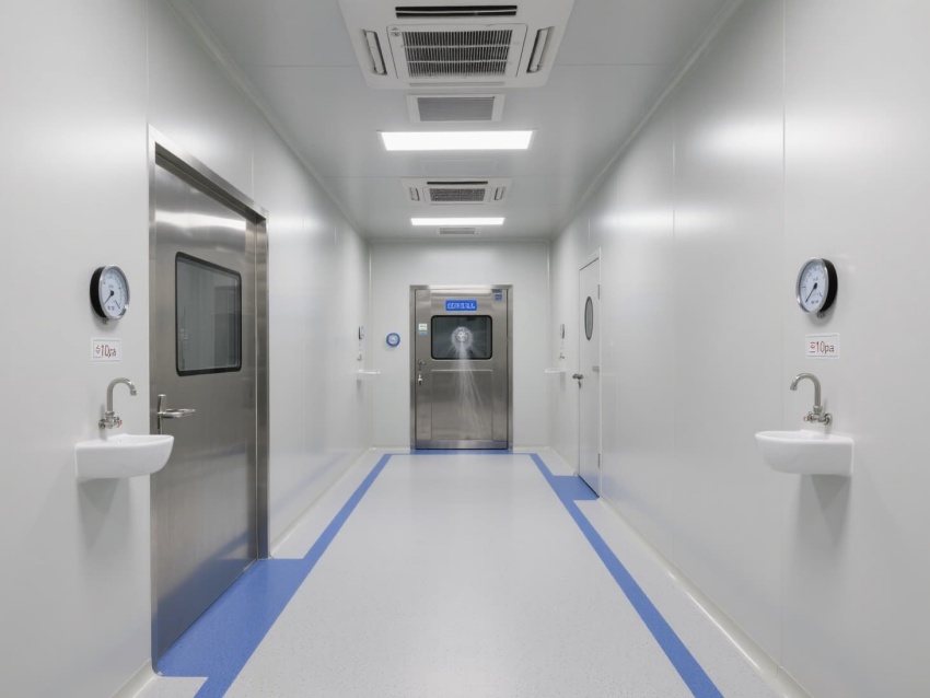 PCR實驗室是基因擴增與檢測的核心場所,嚴格遵循生物安全與潔凈標準。整體以灰白色抗菌彩鋼板為主體,搭配淺藍色防靜電地坪,通過藍色標識線清晰劃分試劑準備、樣本制備、擴增分析等獨立區域,形成單向流布局以防交叉污染。
