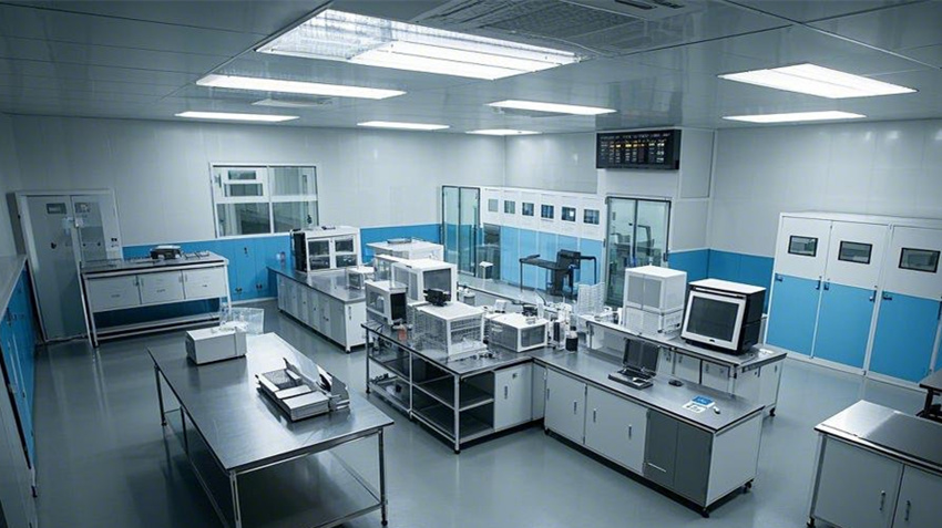 1000平方米電子無塵車間,現代科技風格,干凈整潔,光線明亮。核心生產區占70%,輔助區占20%,辦公區占10%。核心生產區:防靜電環氧地坪(淺灰色),白色彩鋼板墻面和天花板,垂直層流氣流,頂部高效過濾器(HEPA),不銹鋼工作臺,設備排列整齊。輔助區:更衣室(淺藍色墻面,衣柜和長凳),風淋室(透明玻璃門,不銹鋼墻面),物料緩沖間(傳遞窗,白色墻面)。辦公區:玻璃隔斷,現代簡約辦公桌,防靜電PVC地板(淺色),LED面板燈。整體色彩:白色、淺灰色、科技藍點綴。