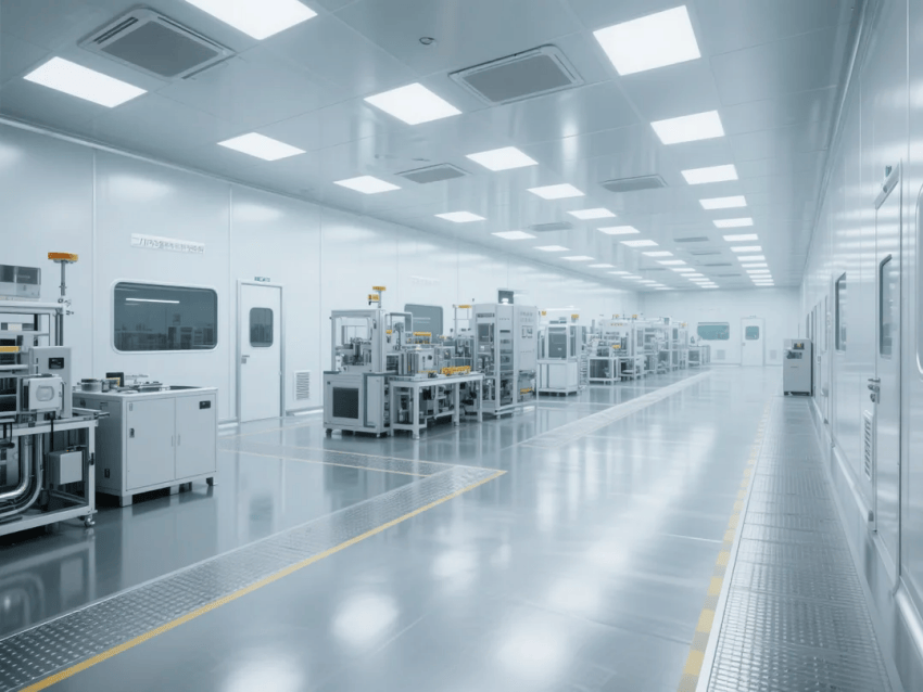 圍護系統(tǒng):50mm厚醫(yī)療級白色彩鋼板墻體,表面采用納米抗菌涂層,所有接縫處采用R30mm圓弧過渡工藝,確保無塵死角。金屬灰防靜電地坪電阻值穩(wěn)定在10^6~10^9Ω范圍,摩擦系數(shù)≥0.6,滿足精密組件生產(chǎn)的防靜電要求。