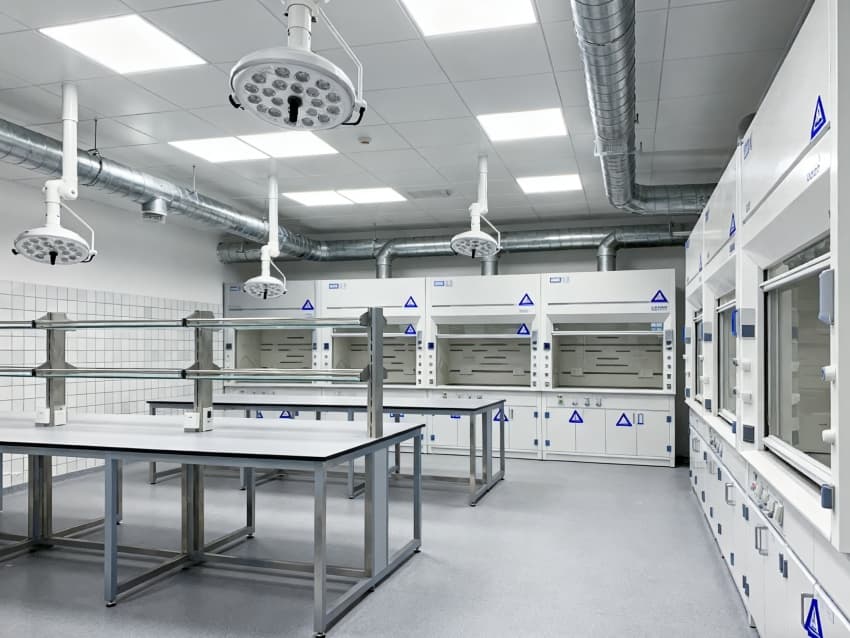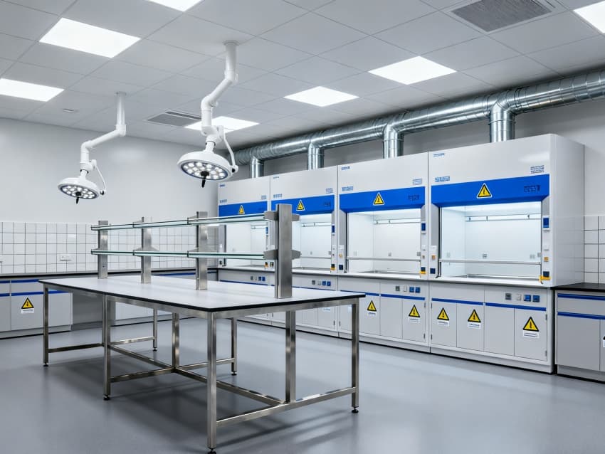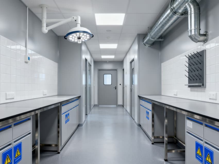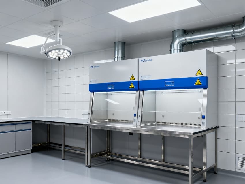 潔凈度執行分級標準:核心操作區達萬級(ISO8級),每立方米空氣中≥0.5μm微粒≤352000個;輔助區域為十萬級(ISO9級),通過初效-中效-高效三級空氣過濾系統,配合側送頂回氣流設計,實現每小時18-22次空氣置換。墻面采用耐酸堿潔凈彩鋼板,地面為防滑PVC無菌卷材,所有接縫密封處理;溫度穩定在22±2℃,濕度控制在45%-55%,關鍵區域維持微負壓,有效避免試劑交叉污染與有害氣體擴散,完全符合生化實驗室建設規范。