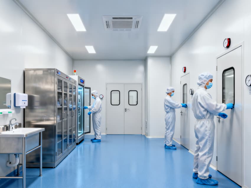 核心生產車間參數差異化設計:原料處理車間為10萬級潔凈區,配備初、中、高效三級過濾系統,高效過濾器效率≥99.99%,送風量2000m³/h;試劑配制車間達萬級潔凈標準,采用頂送風、側回風模式,單向流風速0.3-0.5m/s,溫濕度控制精度±2℃、±5%RH;無菌分裝車間為百級潔凈區,配置層流罩,潔凈度≥0.5μm塵粒≤350個/m³,微生物≤1個/皿。
