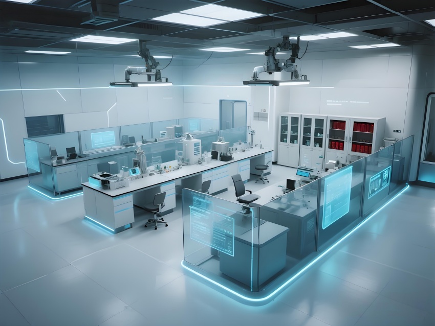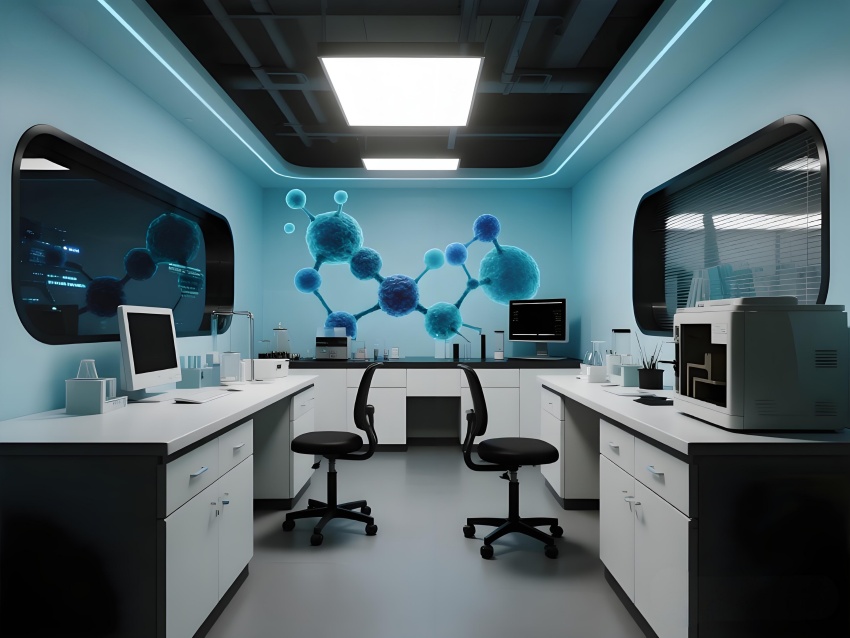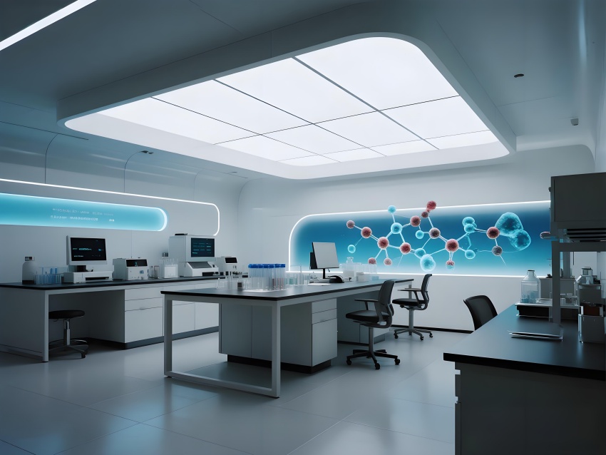 本設計以"科技賦能生命"為核心理念,構建純凈高效的研發環境。主體采用冰川白與醫用藍的漸變配色,墻面嵌入動態生物分子結構LED裝飾,營造科研儀式感。實驗區采用模塊化懸浮工作臺,透明智能玻璃隔斷實現空間通透性與功能分區的完美平衡。頂棚的流線型送風系統與地面熒光導視帶形成立體動線指引。核心無菌區采用圓形穹頂設計,搭配全息投影滅菌提示界面。數據分析中心配備曲面智能白板墻,實時可視化研究數據。?;反鎯^通過紅色光暈警示與物理隔離確保安全。整體空間融合醫療級潔凈美學與科幻實驗室語言,在嚴謹中注入未來感,通過智能交互界面與人性化燈光系統,打造國際一流水準的醫藥研發矩陣空間。