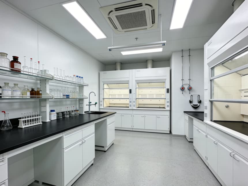 內部檢測空間均以淺灰色耐磨地坪搭配白色無縫潔凈墻面,視覺整潔且適配檢測核心需求。淺灰色地面選用高硬度環氧材質,抗壓耐磨、抗污易清潔,可耐受檢測過程中各類試劑殘留與設備搬運磨損;白色墻面采用環保抗菌涂層,平整度高、反光均勻,搭配嵌入式防眩光照明,為精密檢測提供清晰穩定的視覺環境,減少誤差干擾。