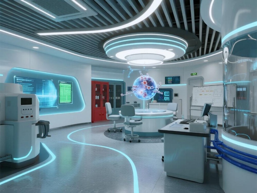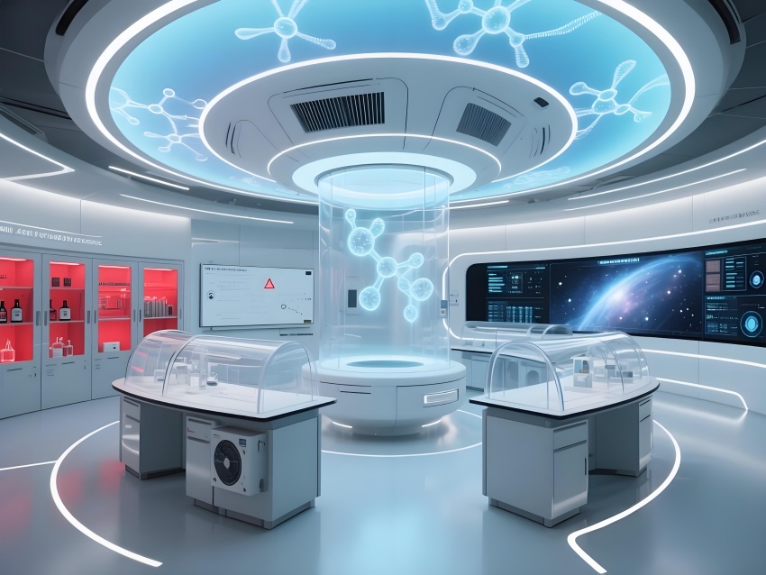 本實驗室宛如一座精密運轉的"環境圣殿",以"絕對環境控制"為靈魂信條。冰川藍與鈦白灰的漸變墻面如同極地冰原與金屬穹頂的完美交融,嵌入式監測屏上躍動的翡翠綠數據流,恰似未來之泉在科技殿堂中潺潺流淌。圓弧形玻璃隔斷如同透明的生物繭房,百級潔凈層流罩在其中吐納著純凈氣流。地面鋪設的防靜電陶瓷鋼板閃爍著冷冽光澤,接縫處的LED指示燈如同守衛環境標準的哨兵。銀色保溫管道與藍色冷媒管在設備區交織出工業交響曲,智能除濕機組半透明的外殼里,冷凝過程正在上演一場液態芭蕾。數據中控室270°曲面屏上,懸浮粒子濃度化作璀璨星云流轉。整個空間以幾何的嚴謹與流體的靈動共舞,在科研的圣殿里譜寫出一曲星際交響詩。
