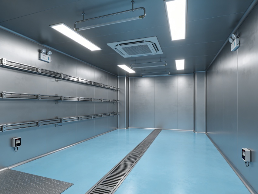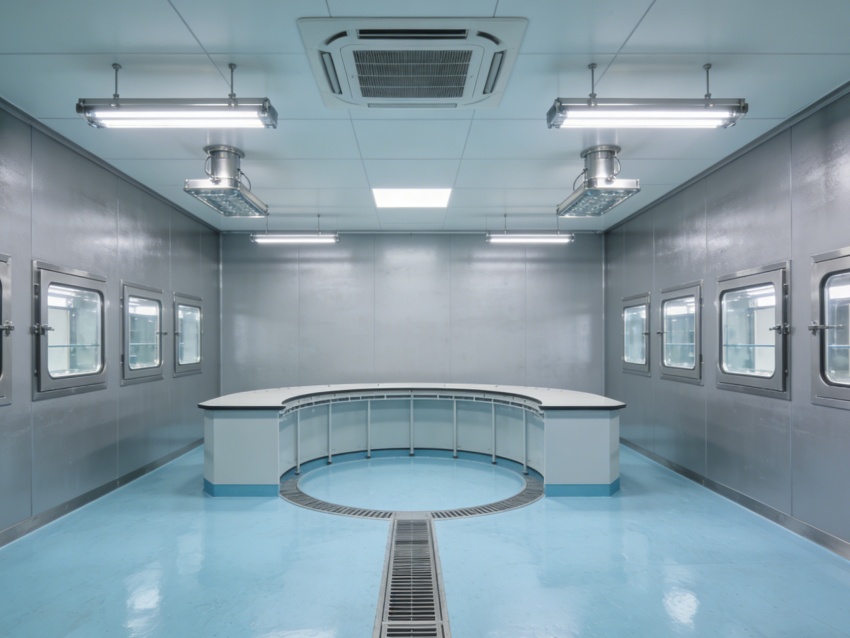 車間內(nèi)部統(tǒng)一采用淺藍色抗菌防靜電地坪搭配灰色無縫工業(yè)級墻面。淺藍色地面選用食品級環(huán)氧材質(zhì),具備優(yōu)異的耐腐蝕性與易消殺性能,可耐受各類清潔試劑,同時有效規(guī)避靜電干擾;灰色墻面采用抗菌涂層無縫拼接,搭配圓弧墻角設(shè)計,徹底杜絕積塵死角,有效降低微生物滋生風險,全面適配無菌環(huán)境嚴苛管控需求。