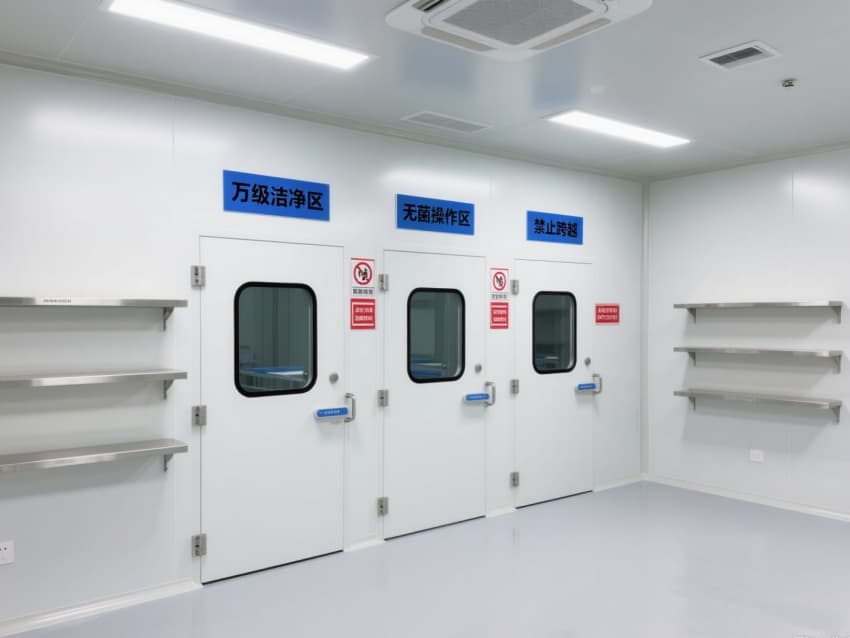 空間內配備不銹鋼潔凈門窗與雙扉傳遞窗,均采用高氣密性密封結構;嵌入式LED潔凈燈提供300-500lux均勻照明,無眩光設計保障操作精度。恒溫恒濕系統精準控制溫度(20-24℃)、濕度(45-60%),藍色功能標識線清晰劃分操作動線,全方位營造安全、穩定的萬級無菌環境。