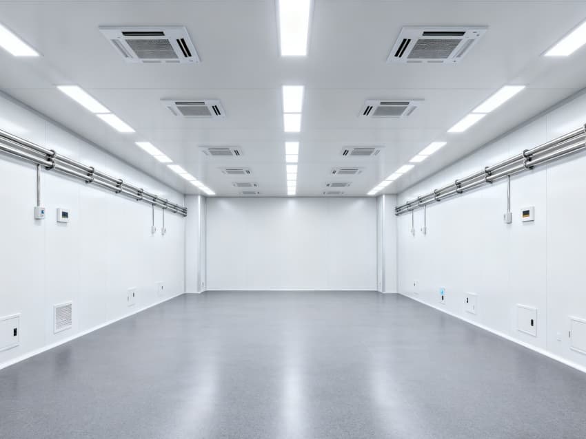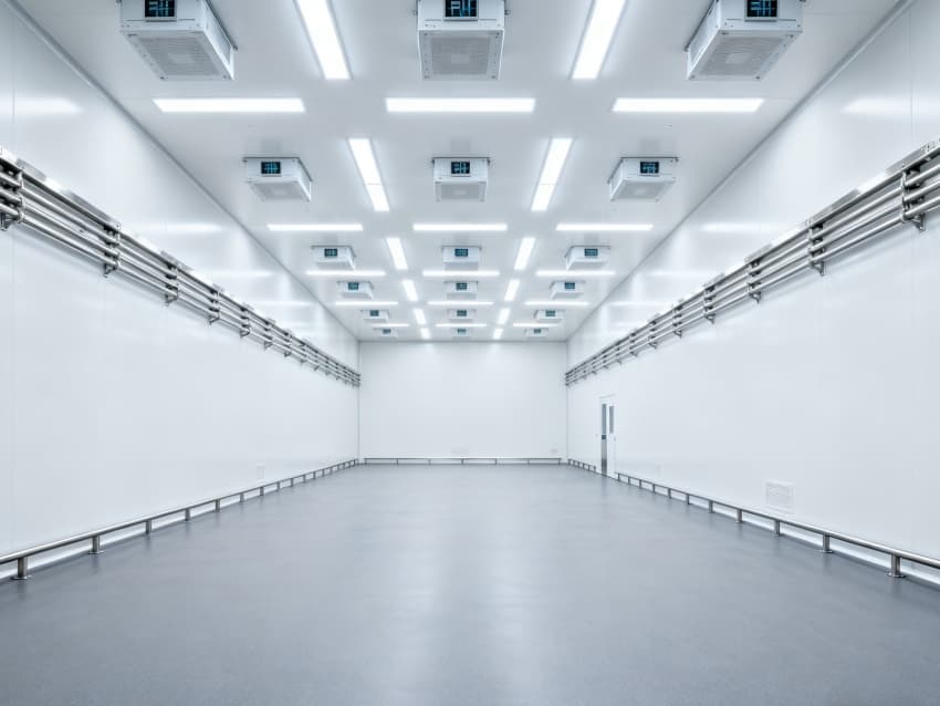 內部6個生產車間均為無設備空曠布局,按百級潔凈標準建設:地面鋪設防靜電環(huán)氧自流平,墻面采用無顆粒潔凈彩鋼板,陰陽角做R30圓弧處理杜絕積塵;柱網間距設為9米,預留光刻機、晶圓檢測設備等重型設備安裝點位;頂部整合恒溫恒濕系統(tǒng)、高效空氣過濾器及防頻閃LED照明,所有管線暗藏于吊頂內,最大化釋放空間高度,為芯片晶圓制造、封裝測試等核心環(huán)節(jié)提供超潔凈、高穩(wěn)定的專屬生產環(huán)境。