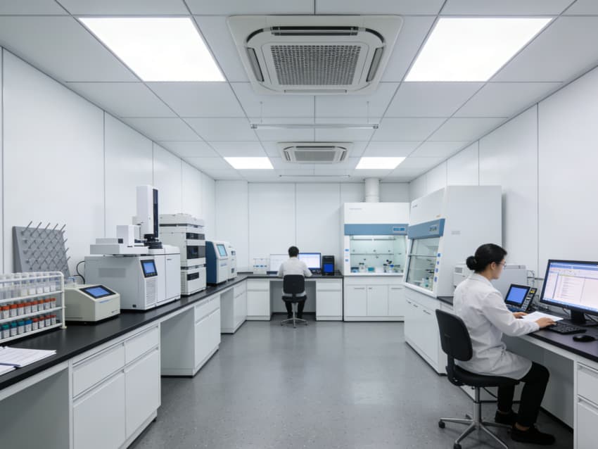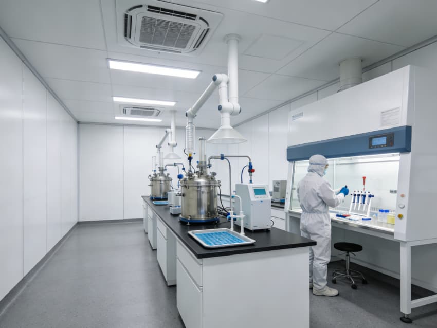 白色墻面采用食品級潔凈抗菌涂層,推行無縫拼接工藝,陰陽角圓弧倒角設(shè)計消除清潔死角,潔凈度可達(dá)Class 7級標(biāo)準(zhǔn)。車間科學(xué)劃分抗體表達(dá)區(qū)、偶聯(lián)反應(yīng)區(qū)、純化區(qū)等功能區(qū)域,各區(qū)域配備獨(dú)立層流凈化與負(fù)壓防護(hù)系統(tǒng),偶聯(lián)區(qū)預(yù)留精密溫控與惰性氣體接口,純化區(qū)設(shè)置無菌物料傳遞窗口,全方位規(guī)避交叉污染,保障研發(fā)生產(chǎn)的安全性與合規(guī)性。